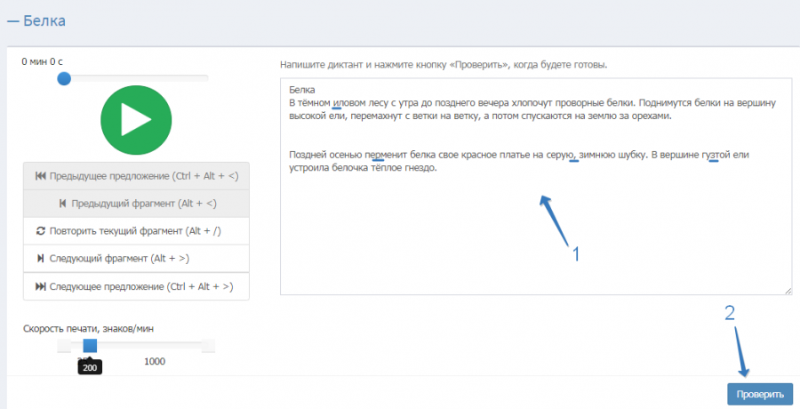 2. В открывшемся окне в поле с диктантом (1) сделайте максимальное количество орфографических и пунктуационных ошибок, которые могут допустить пишущие. Так вы узнаете, насколько на самом деле готов диктант и стоит ли вносить дополнительные ошибки, допустимые варианты, исправлять старые правила, редактировать пояснения и т. д. В завершение нажмите «Проверить» (2).