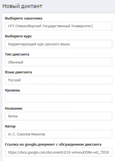 2. На открывшейся странице «Новый диктант» заполните все необходимые поля, каждый раз вставляя курсор в поле ввода и выбирая из списка предложенного нужное значение: