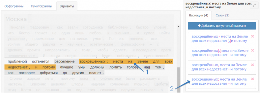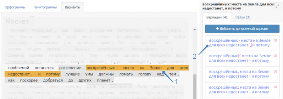 1. Чтобы создать допустимый вариант для фрагмента, нужно выделить его — кликните на первое слово фрагмента → зажмите клавишу Alt → кликните на последнее слово фрагмента (1). Нажмите «Добавить допустимый вариант» (2).