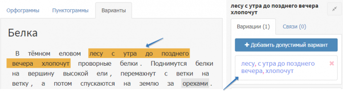 1. Чтобы создать допустимый вариант для фрагмента, нужно выделить его — кликните на первое слово фрагмента → зажмите клавишу Alt → кликните на последнее слово фрагмента (1), а замет кликнуть на «Добавить допустимый вариант» (2).