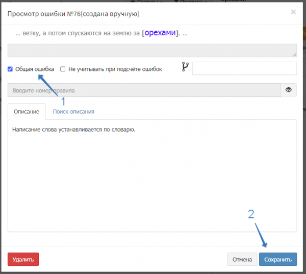3. Вернитесь к исходному слову и пропишите через запятую номера идентичных ошибок, просмотренных только что у однокоренных слов (1). Нажмите «Сохранить» (2). Таким образом, при множественном допущении пишущим ошибок в одном и том же месте (например, в одном корне), засчитается только одна ошибка, а вот описания ошибок будут показываться для каждого слова.