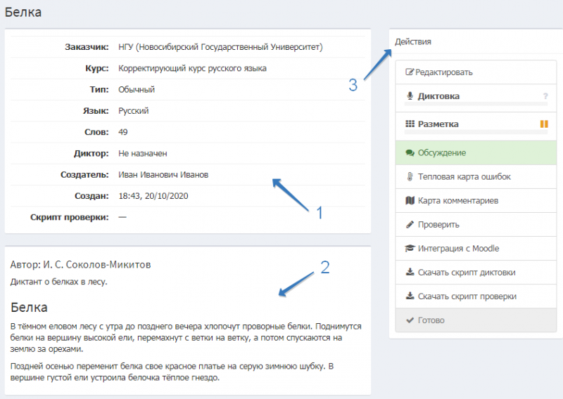 • Проверить — протестировать (создателю диктанта или любому другому пользователю, имеющему на то права) готовый диктант: написать его самостоятельно под диктовку, проверить качество записи, намеренно допустить орфографические и пунктуационные ошибки, чтобы удостовериться, что все правила разметки срабатывают верно.